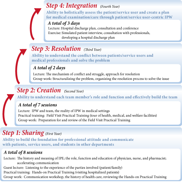 Inohana IPE is a phased, comprehensive education program consisting of four steps, Step 1 (freshman) through Step 4 (senior). Each step has learning objectives.
